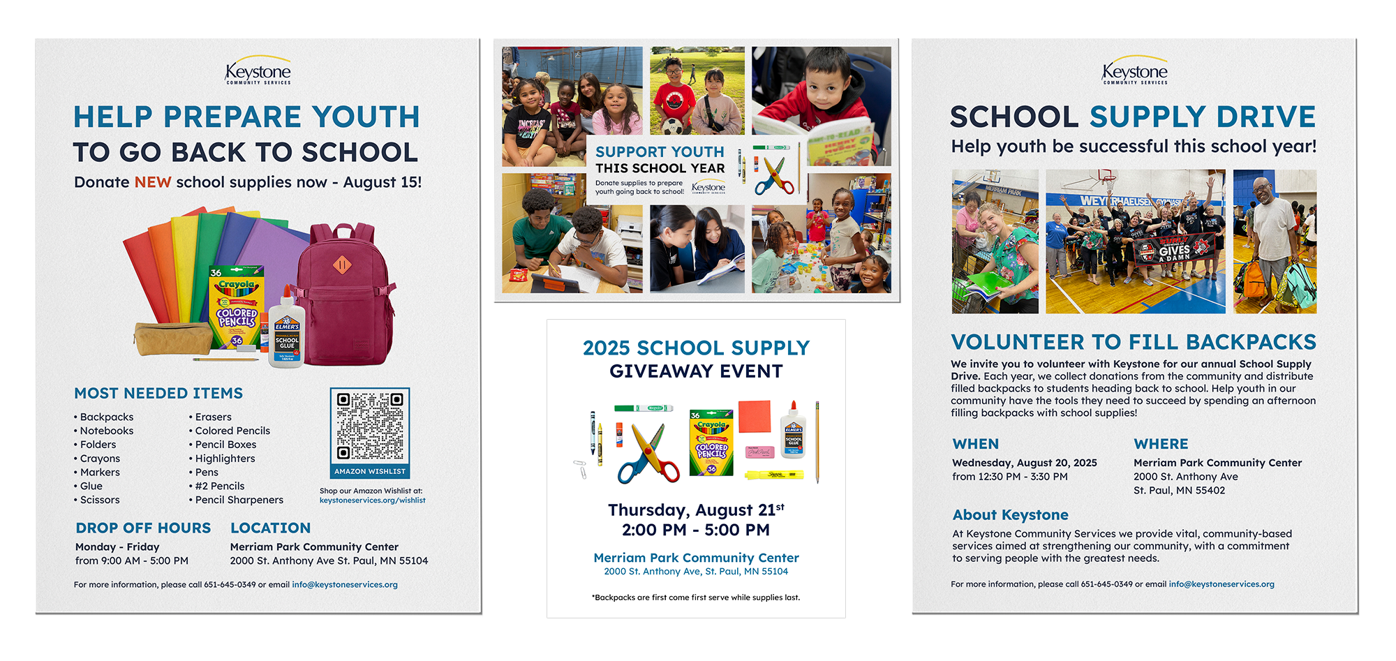 In collaboration with the Volunteer and Development team, I created promotional material for the organizations annual School Supply Distribution Event. This involved creating a Facebook events page, printed material, social media content, a newspaper ad, and a mailed postcard. The event was a success and saw a total of 936 backpacks full of school supplies distributed to families.