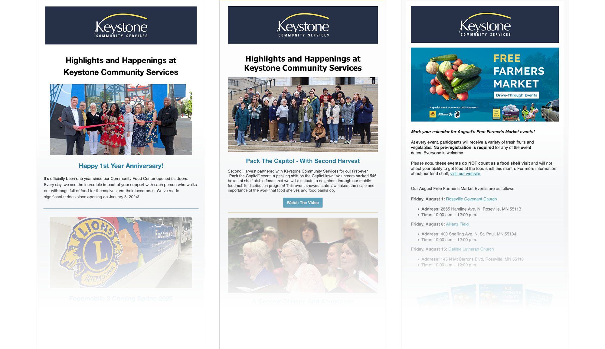 One of my goals at Keystone was to shift the focus of the quarterly newsletter from being primarily food (Basic Needs Services) focused to highlighting different areas by including Seniors Services, Youth Service stories and Express Bike Shop news. I worked with various department directors to gather content, the advancement team for a mailing list, and print vendors to ensure the mailer went out on time.