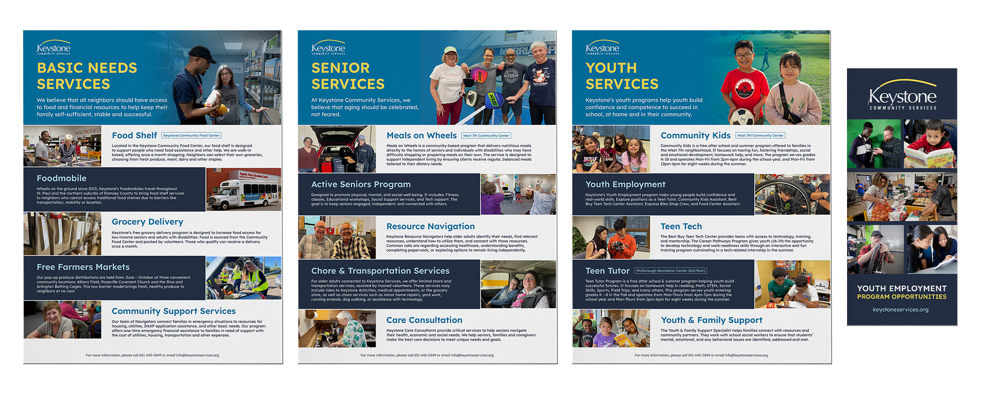 Keystone provides 3 types of services which are Basic Needs Services, Senior Services, and Youth Services. I collaborated with program Directors to create overview flyers and a brochure to communicate information to with program participants, donors, and outreach tabling events. This project was part of the overall goal to create more consistent branding across the different programs.